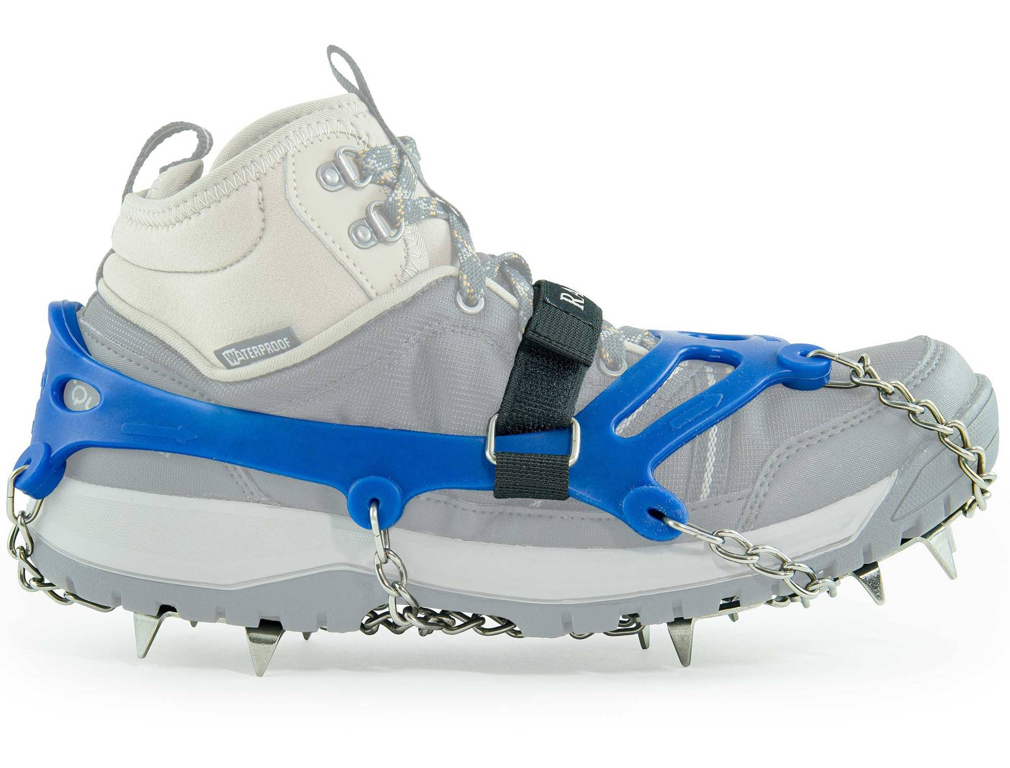 • Einfache Befestigung: Die Spikes werden mit Gummiringen, einem System rostfreier Ketten und einem Klettverschlussriemen am Schuh befestigt. Diese Verbindung ermöglicht es ihnen, sicher an verschiedenen Arten von Schuhwerk zu haften, einschließlich Wanderschuhen und Winterstiefeln.