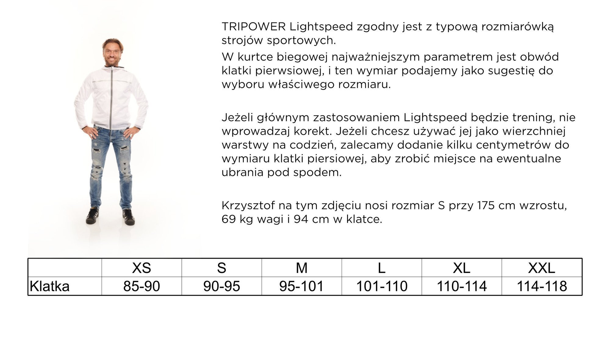 Die Tripower Lightspeed-Jacke entspricht der typischen Größentabelle für Sportbekleidung. Der Brustumfang ist bei Laufjacken das wichtigste Maß, und diese Maße werden als Empfehlung für die Auswahl der richtigen Größe angegeben.