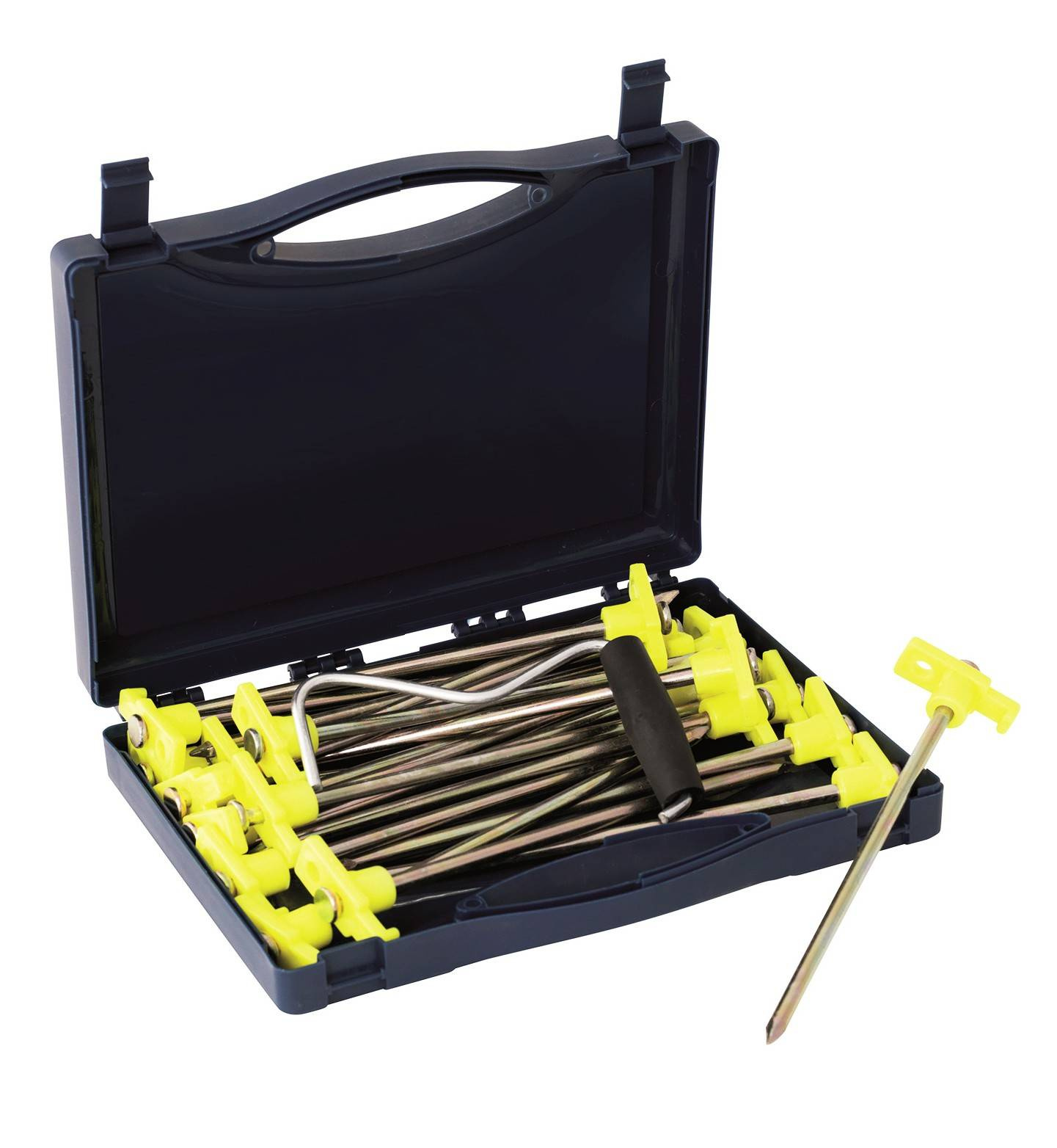 Die Spike Peg Box ist ideal für Campingtrips und enthält 20 stabile Heringe zur Befestigung deiner Campingunterkunft. Sie bestehen aus Stahl und haben einen Durchmesser von 6,5 mm. Die Heringe sind T-förmig gestaltet, wodurch sie sich leicht in den Boden einschlagen lassen. Zum Entfernen liegt dem Set ein spezieller Ausziehhaken bei.