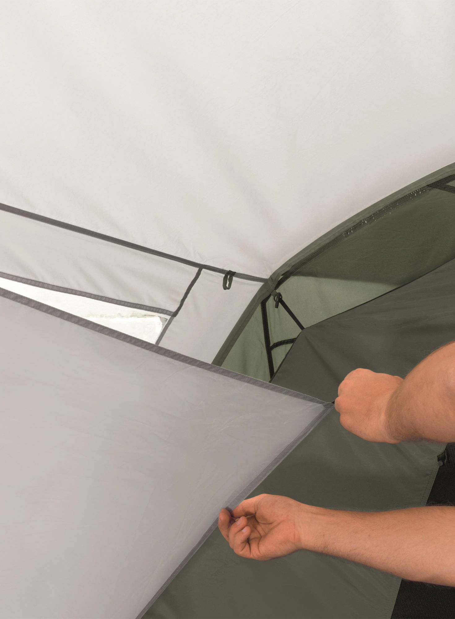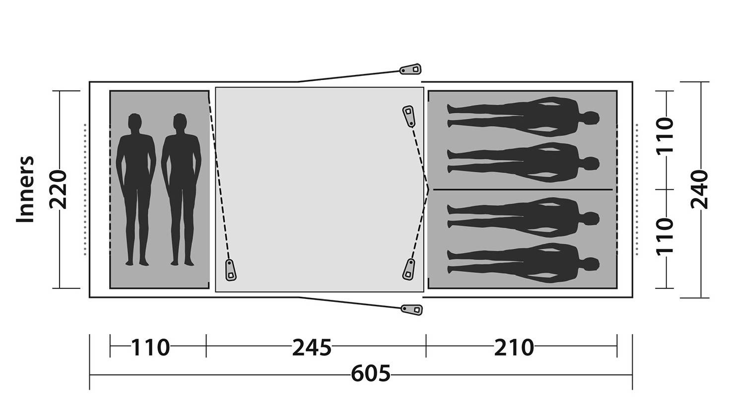 Das Modell verfügt über drei Schlafkabinen aus atmungsaktivem Polyester. Durch den abgedunkelten Stoff ist auch nach Sonnenaufgang ein erholsamer Schlaf möglich. Der Boden in den Schlafkabinen besteht aus strapazierfähigem Polyethylen. Zusätzlich ist auch der Vorraum mit einer Bodenplane ausgestattet, was das Eindringen von Insekten reduziert.