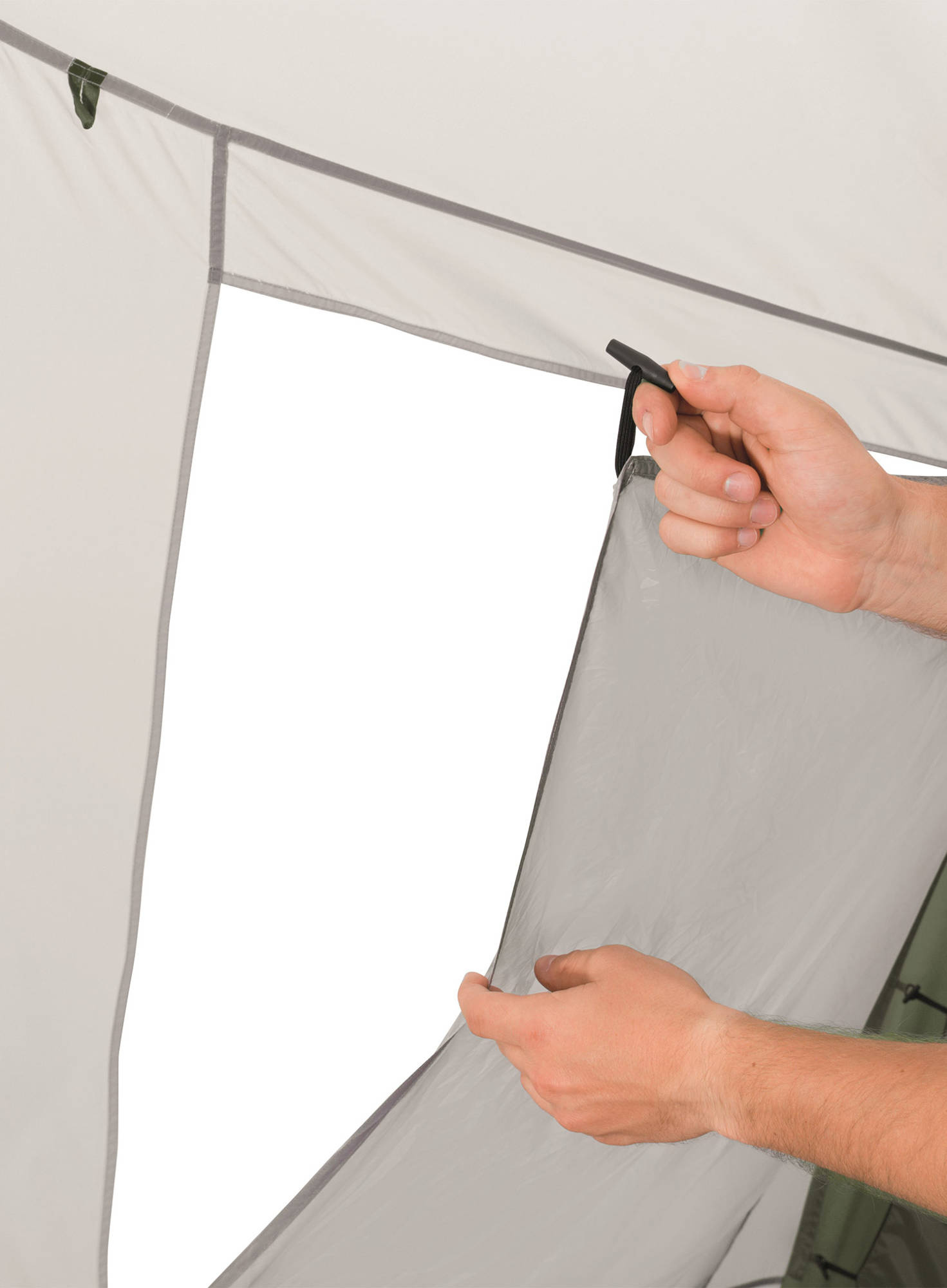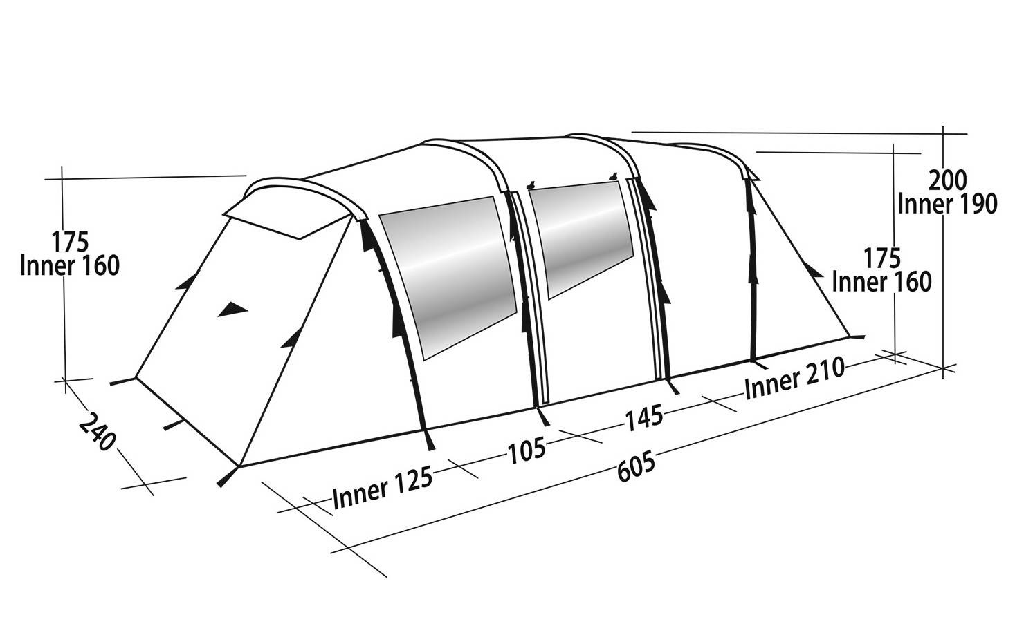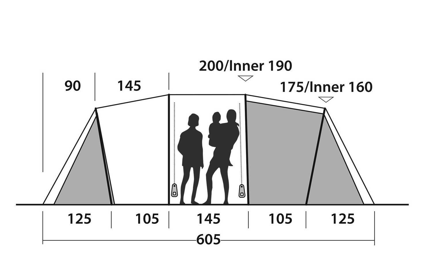 Der großzügige Vorraum bietet zwei Eingänge an den Seitenwänden. Große Fenster mit Vorhängen sorgen für viel Tageslicht und Privatsphäre nach Bedarf. Belüftungsöffnungen vorne und hinten gewährleisten eine gute Luftzirkulation. In den Schlafkabinen befinden sich praktische Taschen für Kleinteile, außerdem gibt es eine Aufhängemöglichkeit für eine Lampe. Zum Lieferumfang gehört eine Transporttasche.