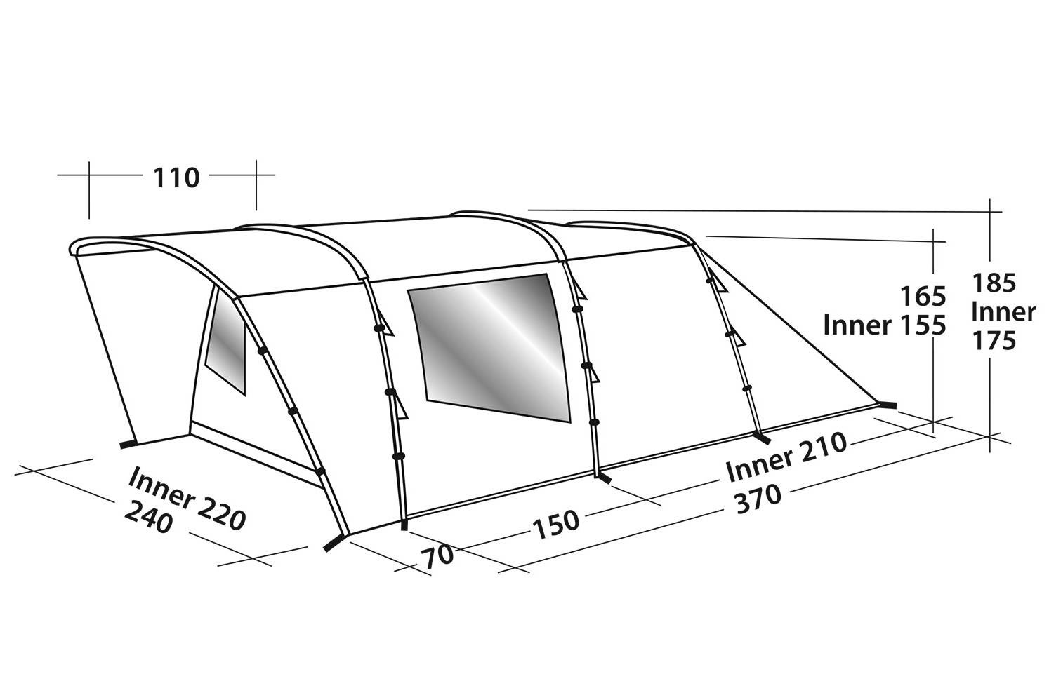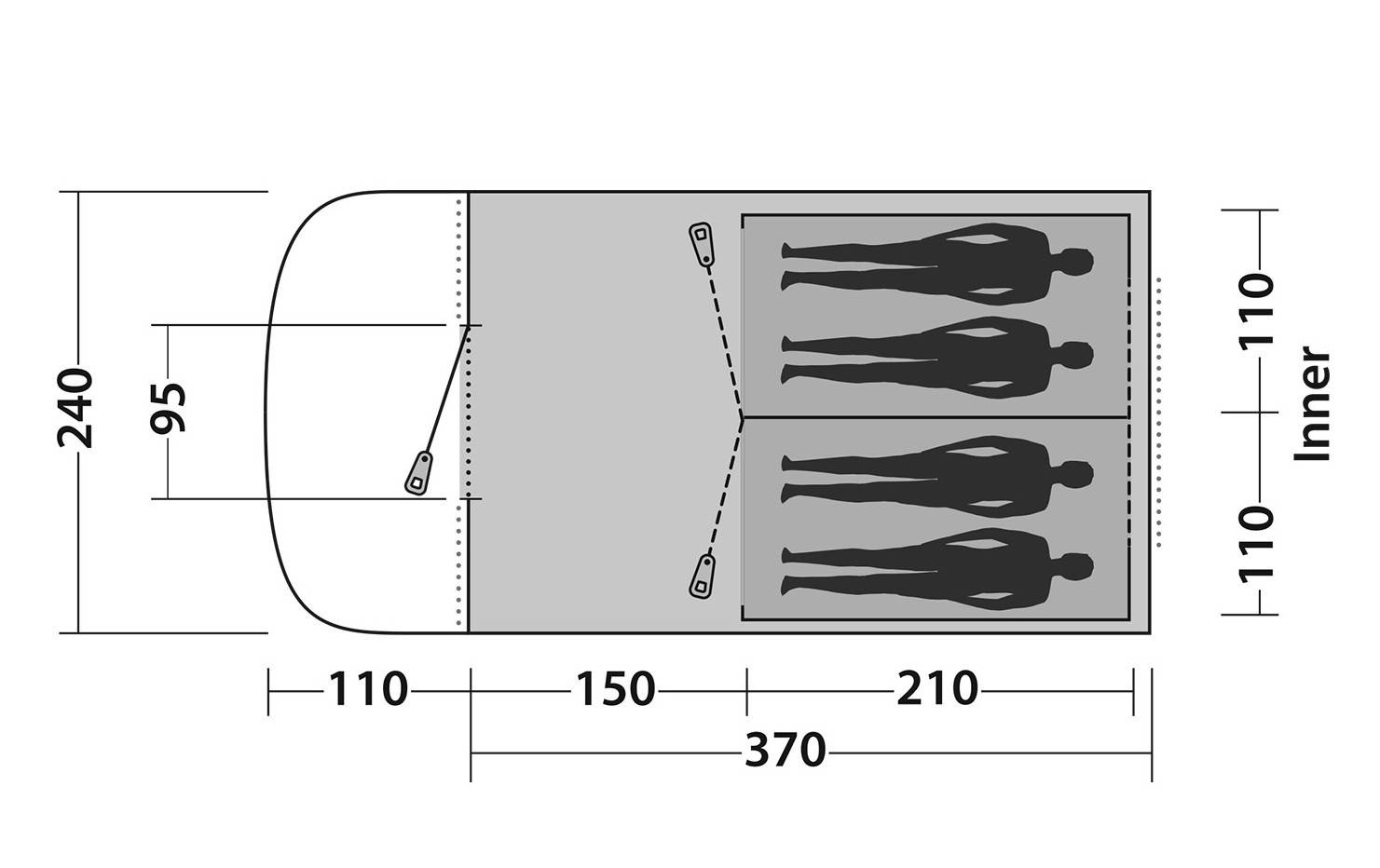 Das Zelt verfügt über zwei separate Schlafkabinen, die bei Bedarf zu einer großen Kabine verbunden werden können. Die Schlafräume bestehen aus atmungsaktivem Polyester; der abgedunkelte Stoff sorgt für erholsamen Schlaf selbst nach Sonnenaufgang. Der Boden in den Schlafkabinen besteht aus strapazierfähigem Polyethylen. Zusätzlich ist auch der Vorraum mit einer Bodenplane ausgestattet, was das Eindringen von Insekten reduziert.