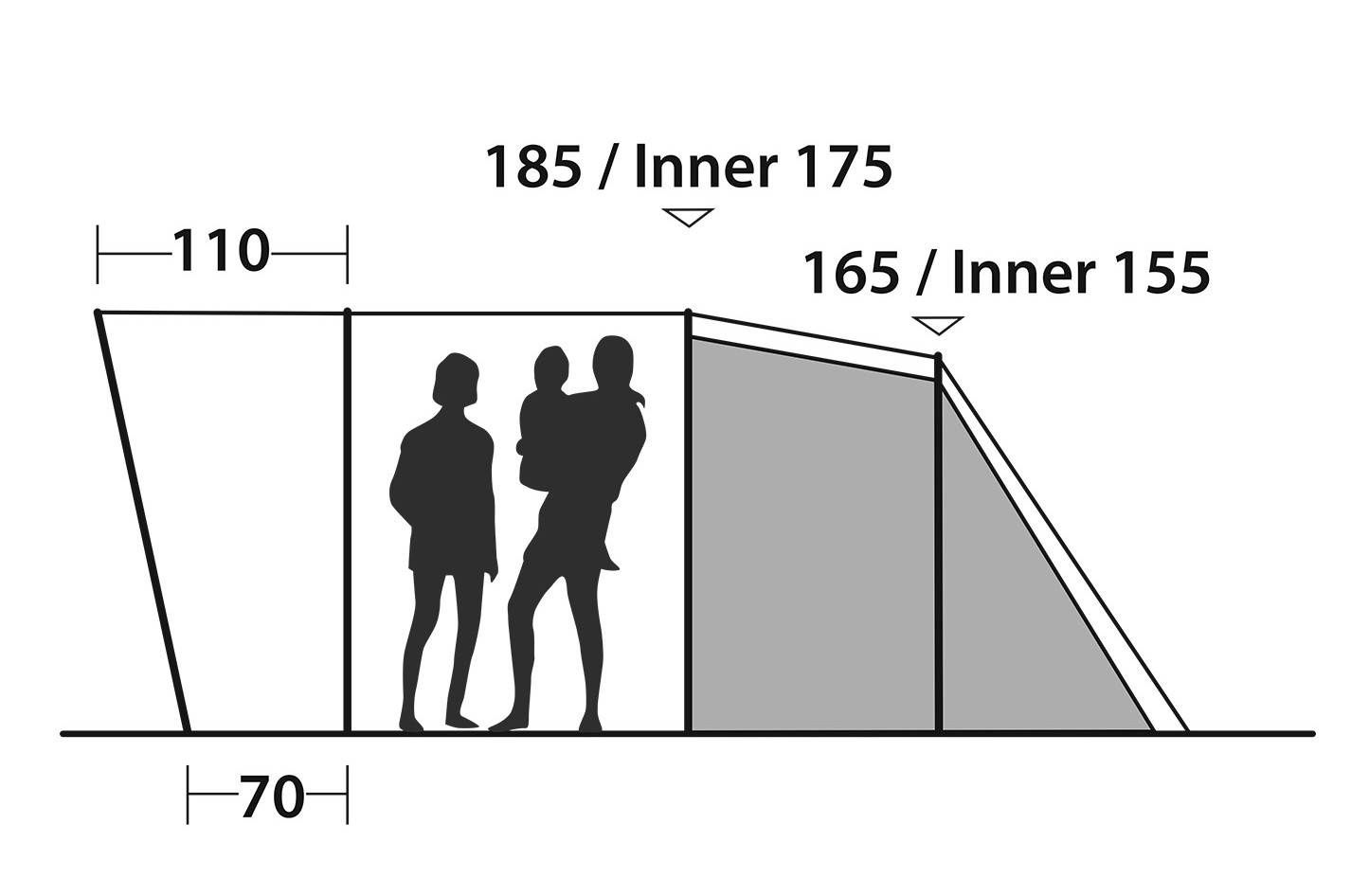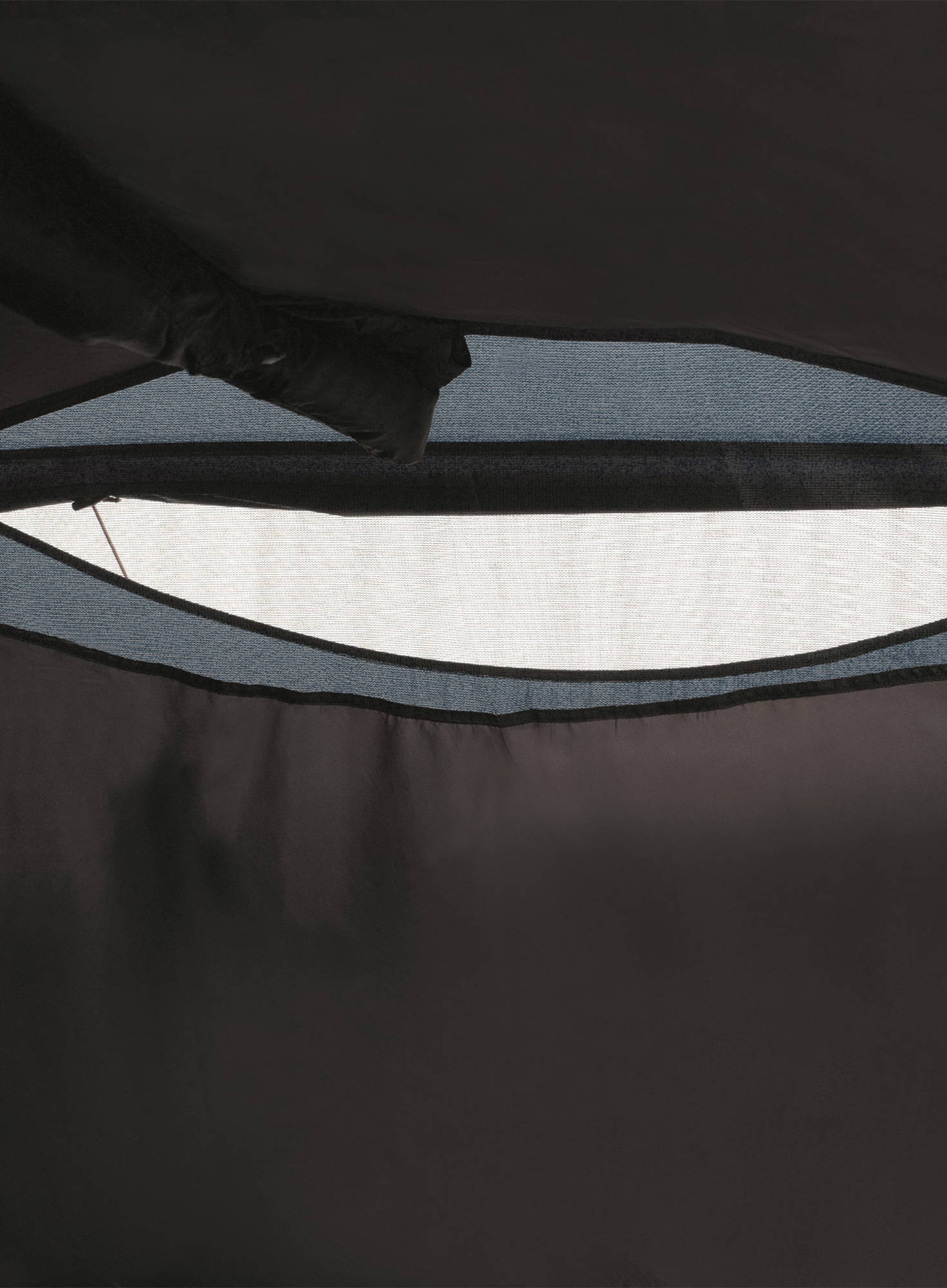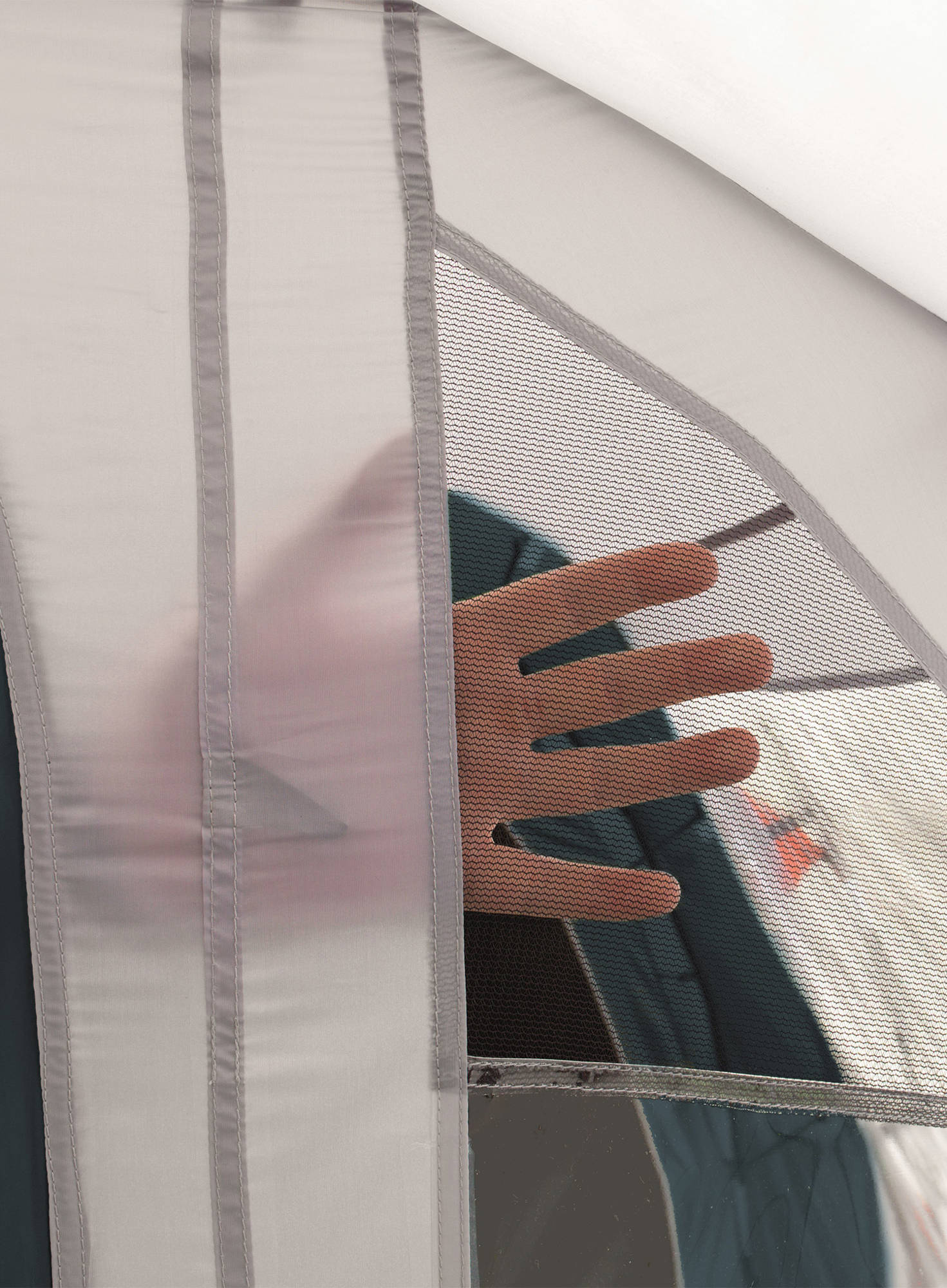 Der großzügige Vorraum besitzt eine Fronttür aus Mesh, die für gute Belüftung sorgt und Insekten fernhält. Vorn befindet sich zudem ein Vordach, das zusätzliche überdachte Fläche bietet. Seitlich des Eingangs liegen verschließbare Ventilationsöffnungen, außerdem gibt es Seitenfenster mit Vorhängen. Hinten sorgt eine weitere Lüftungsöffnung für angenehme Luftzirkulation.