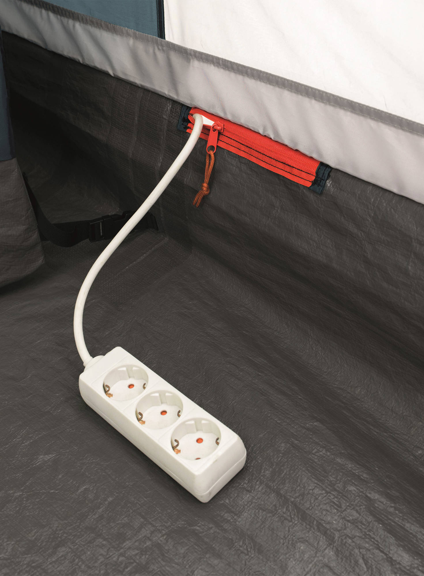 Im Inneren der Schlafkabinen findest du praktische Taschen für Kleinteile, zusätzliche Stautaschen sind im Vorraum vorgesehen. Ein spezieller Kabeldurchlass in Bodennähe ermöglicht das sichere Einführen von Stromkabeln. Eine Aufhängemöglichkeit für eine Lampe ist ebenfalls vorhanden. Geliefert wird das Zelt mit einer Transporttasche.