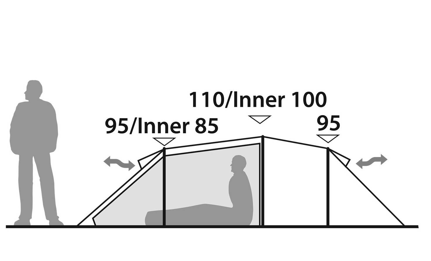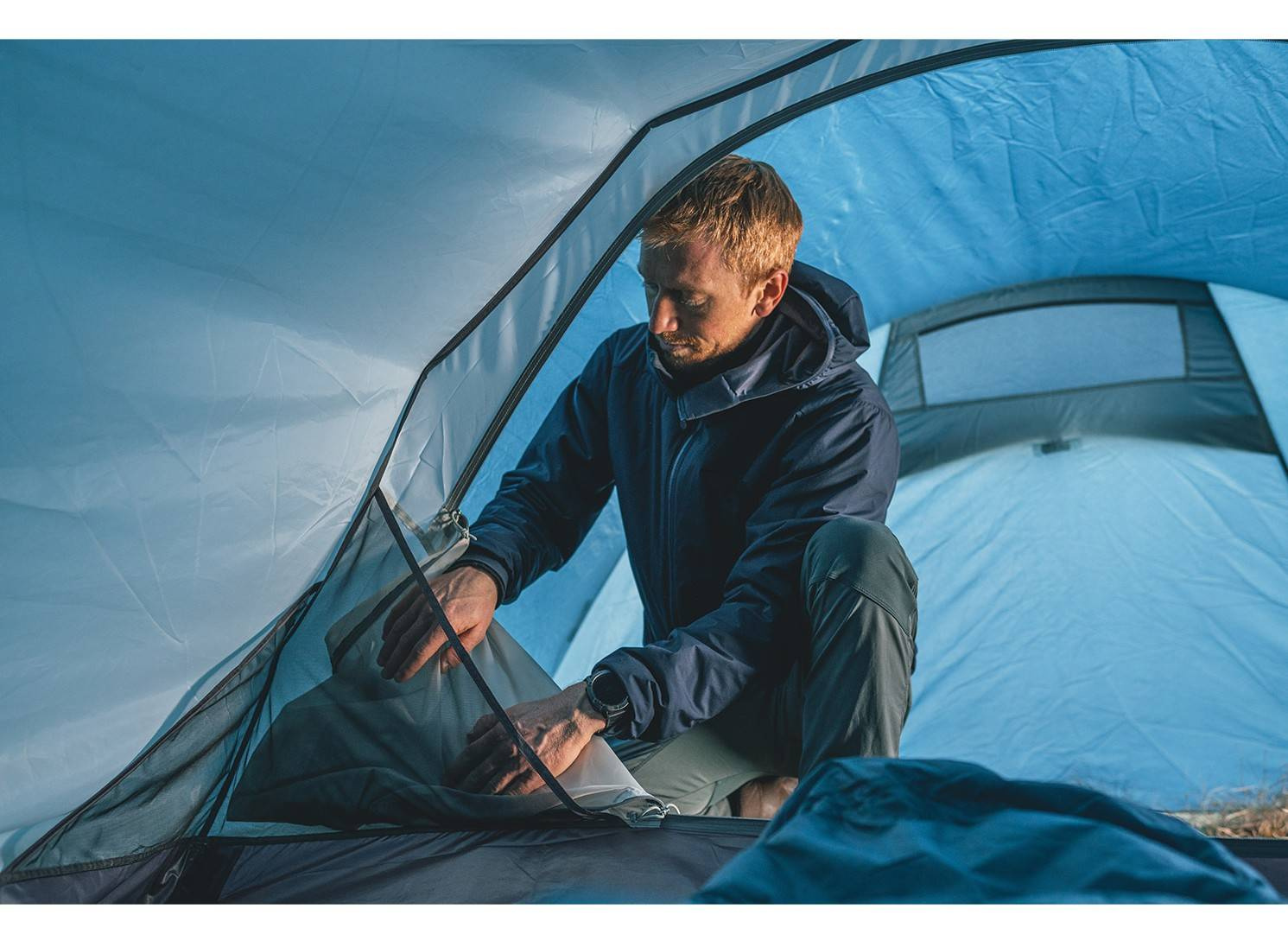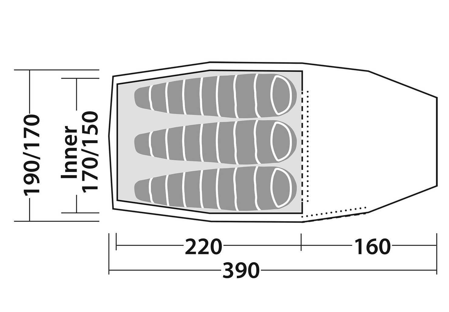 Für den Schlafbereich wurde angenehmes, atmungsaktives Polyester verwendet. Im Zelt gibt es Platz für drei Personen zum Schlafen. Der Eingang des Schlafbereichs verfügt über ein oberes Netzpanel, das eine gute Belüftung ermöglicht, ohne Insekten einzulassen. Die Türen können geöffnet und in einer speziellen Tasche verstaut werden. Der Zeltboden besteht aus strapazierfähigem Polyester mit einer Wasserdichtigkeit von 6000 mm Wassersäule. Der Zugang zum Schlafbereich befindet sich an der Seitenwand des Außenzeltes, während die Vordertüren mit einem D-förmigen Reißverschluss versehen sind. Zusätzlich gibt es vorne am Zelt ein Belüftungsfenster.