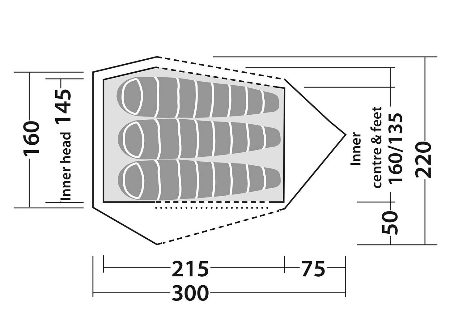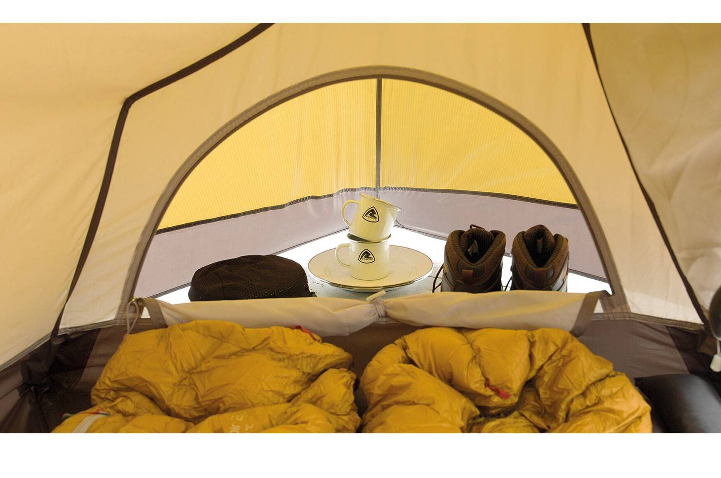 Das Zelt verfügt über einen seitlichen Eingang und bietet viel Kopffreiheit. Zusätzliche hintere Türen erleichtern das Ein- und Aussteigen aus dem Zelt, ohne andere im Zelt schlafende Personen zu wecken. Trotz seiner Größe ist dieses Modell relativ leicht, und durch die Verschiebung des Schlafbereichs besitzt es auch einen kleinen Vorbau, in dem Sie Ihren Rucksack oder Ihre Schuhe aufbewahren können. Im Inneren des Schlafbereichs befinden sich Netztaschen, die eine bequeme Aufbewahrung von notwendigem Zubehör ermöglichen, sowie eine Leine zur Aufhängung zusätzlicher Ausrüstung.