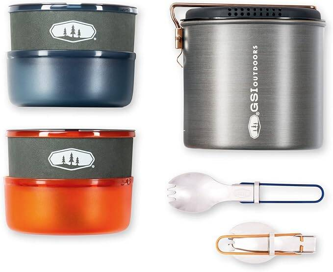 Geschirr im Set: 2 Becher à 590 ml mit Neoprenhüllen und Trinkdeckeln, 2 Schüsseln à 590 ml, 2 klappbare GSI Glacier Folding Sporks.