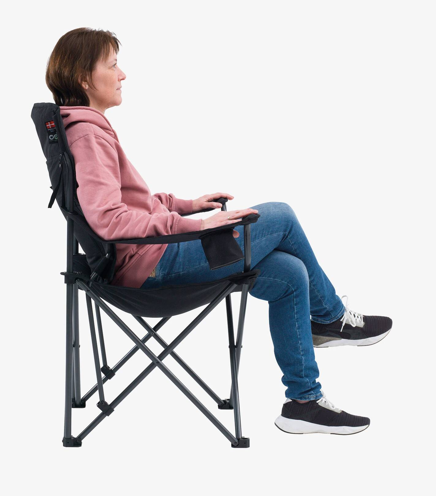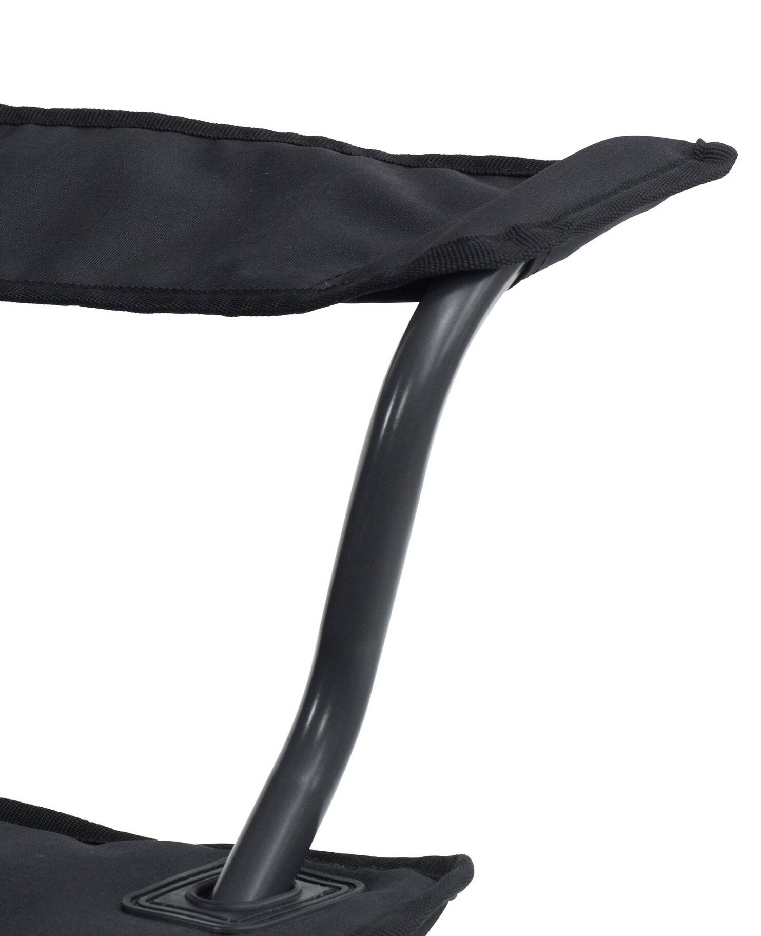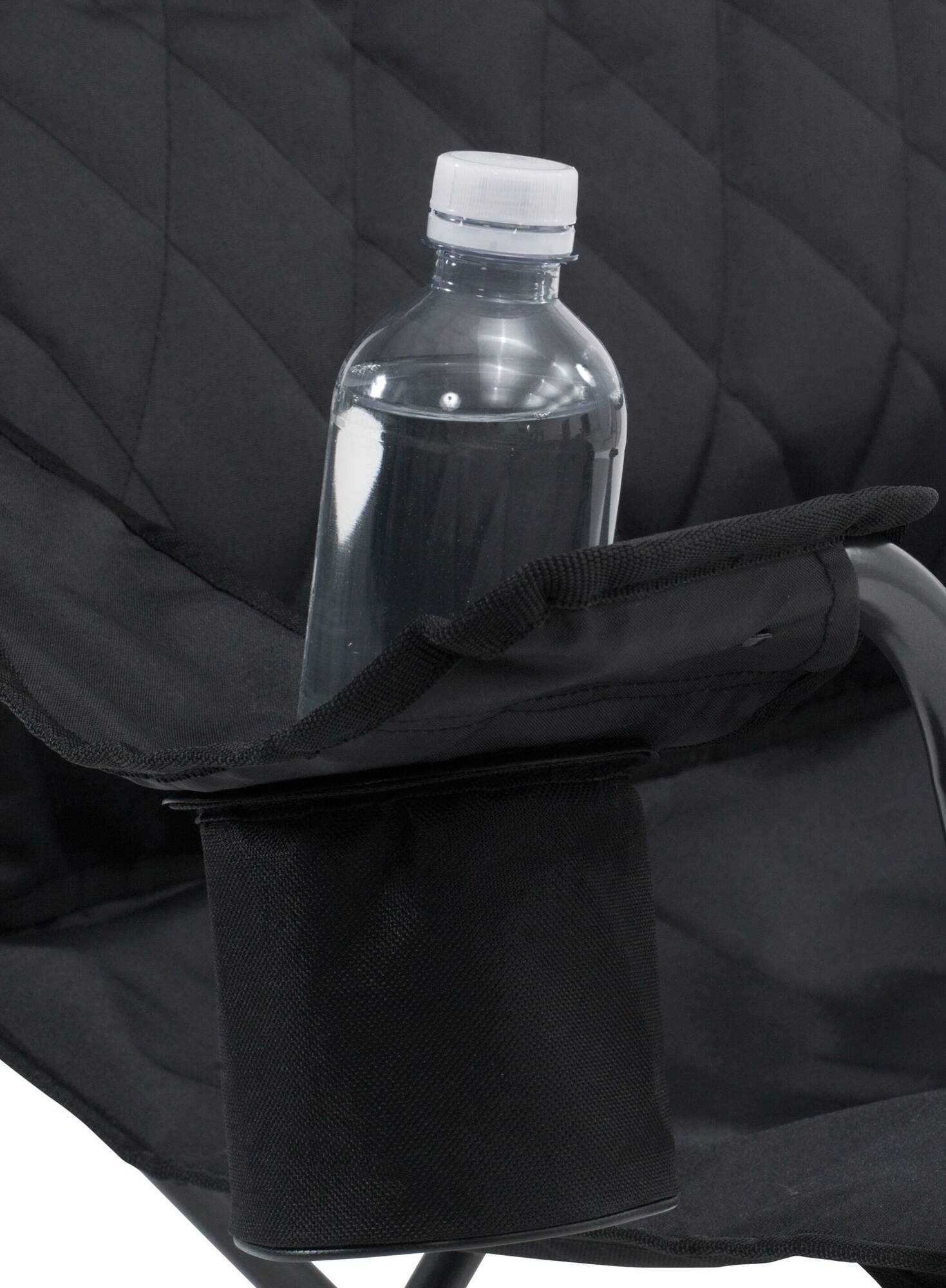 Für zusätzlichen Komfort sorgen die breiten, gepolsterten Armlehnen, die sich in der Höhe verstellen lassen. An einer Armlehne befindet sich ein praktischer Getränkehalter für Flasche oder Becher. Der Stuhl lässt sich in wenigen Sekunden auf- und zusammenklappen und erfordert keinerlei Montage. Im Lieferumfang ist eine Transporttasche enthalten, die den Transport und das Verstauen erleichtert. Die maximale Belastbarkeit beträgt 125 kg.