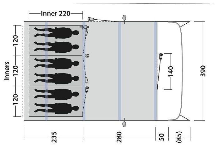 - Das Moonhill 6 Air ist ein Modell mit aufblasbarem Gestell. Es verfügt über 2 Schlafkabinen, 1 Innenvorzelt und 1 offenen Vorraum.