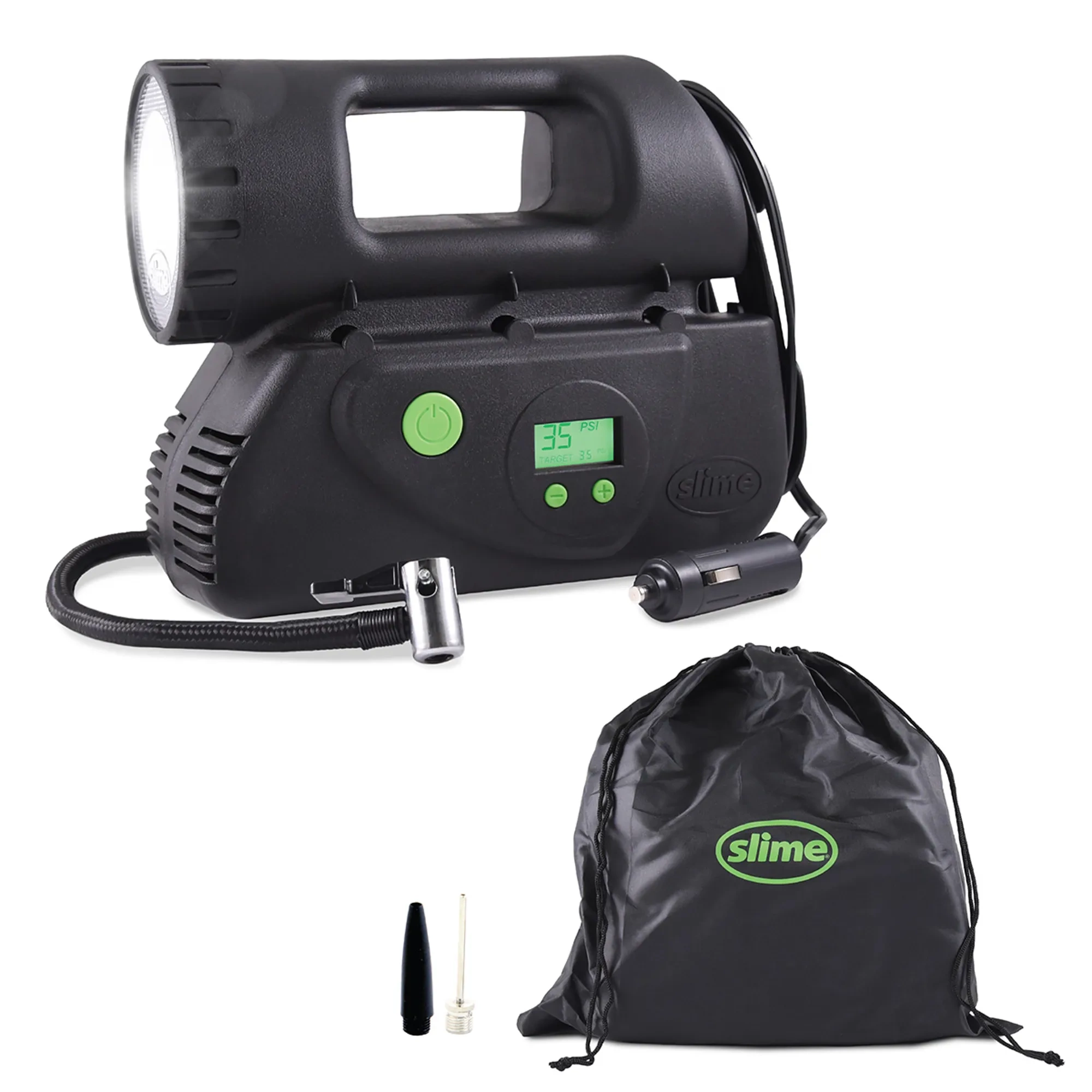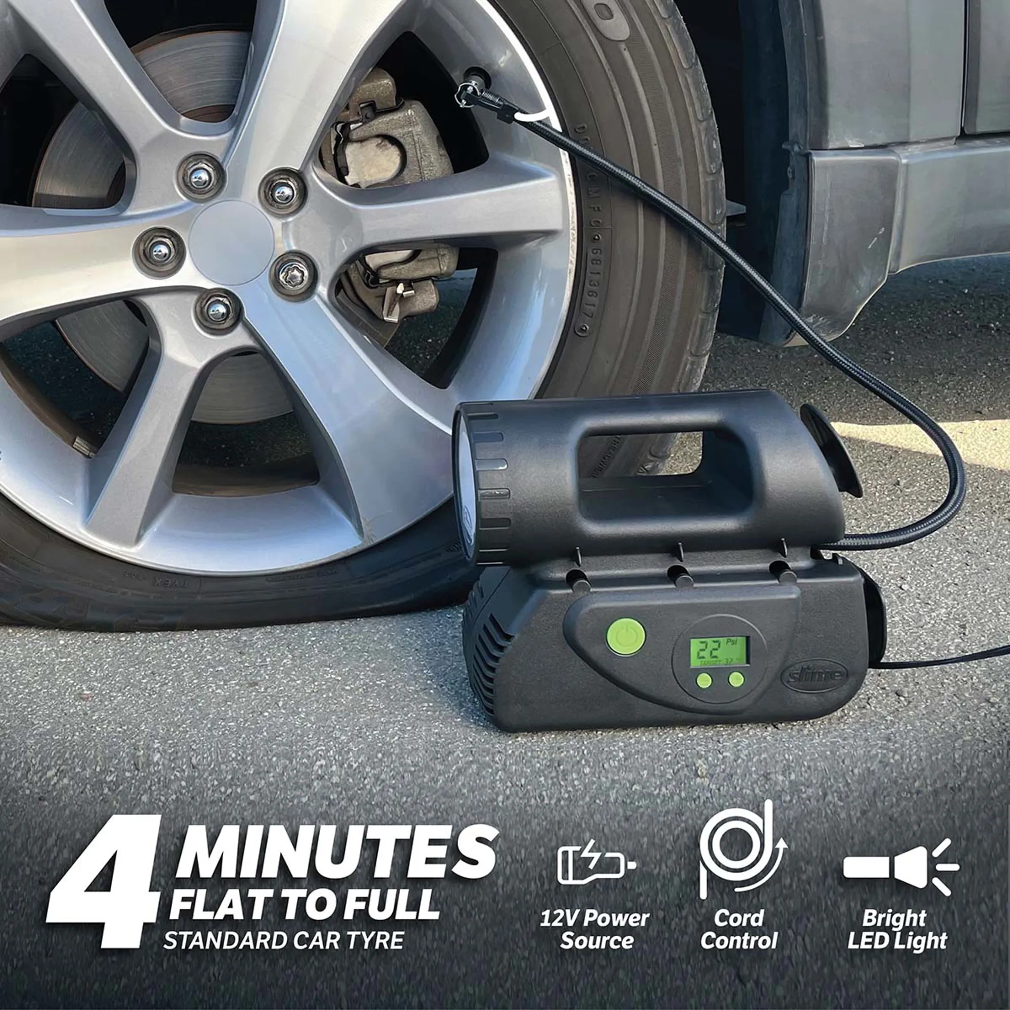 The Slime Deluxe Digital 12V Tyre Inflator is a compact and powerful air compressor featuring an easy-to-read digital display and automatic shut-off via Inflate Right™ technology. Perfect for inflating car tyres, bicycle tyres, balls, and inflatables. It connects to a vehicle’s 12V outlet and includes a bright LED work light, built-in cord storage, and a convenient storage bag. A standard car tyre (P195/65R15) inflates from 0 to 2.4 bar in just 4 minutes.